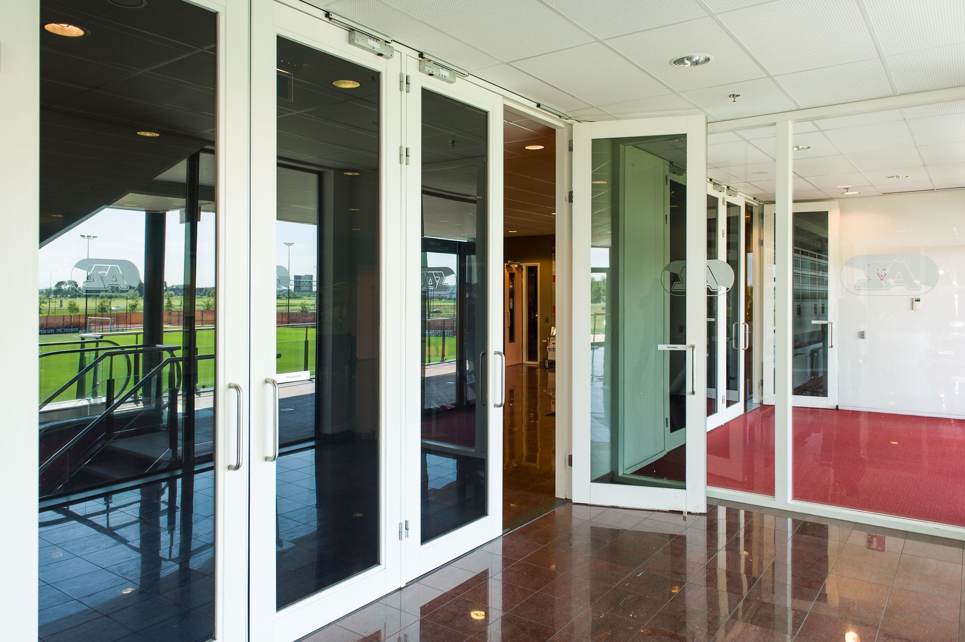 In de kantoren van het AZ voetbalstadion was de eis van de doorkijk niet noodzakelijk en hebben wij een spiegelende warmtewerende glasfolie aangebracht met een warmtewering van 82%. De raamfolies zijn voorzien van een hardcoat beschermlaag.