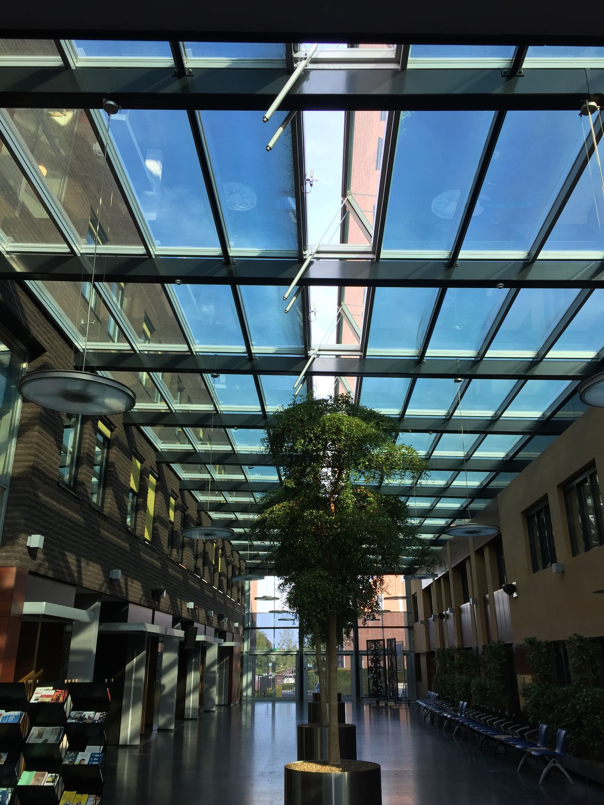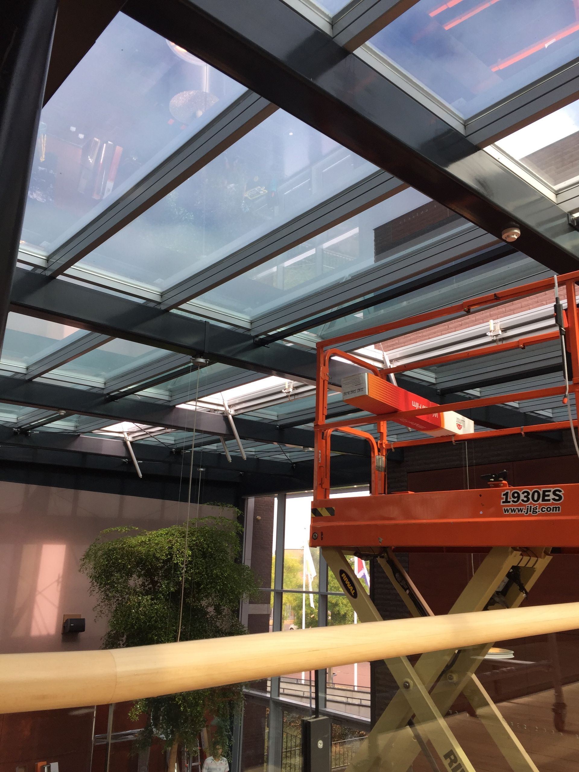 Daarnaast hebben wij in dit gemeentehuis het glazen dak in de gemeenschappelijke ruimte voorzien van een warmtewerende glasfolie aan de binnenzijde van de ruiten. Deze is met behulp van een hoogwerker toegepast.