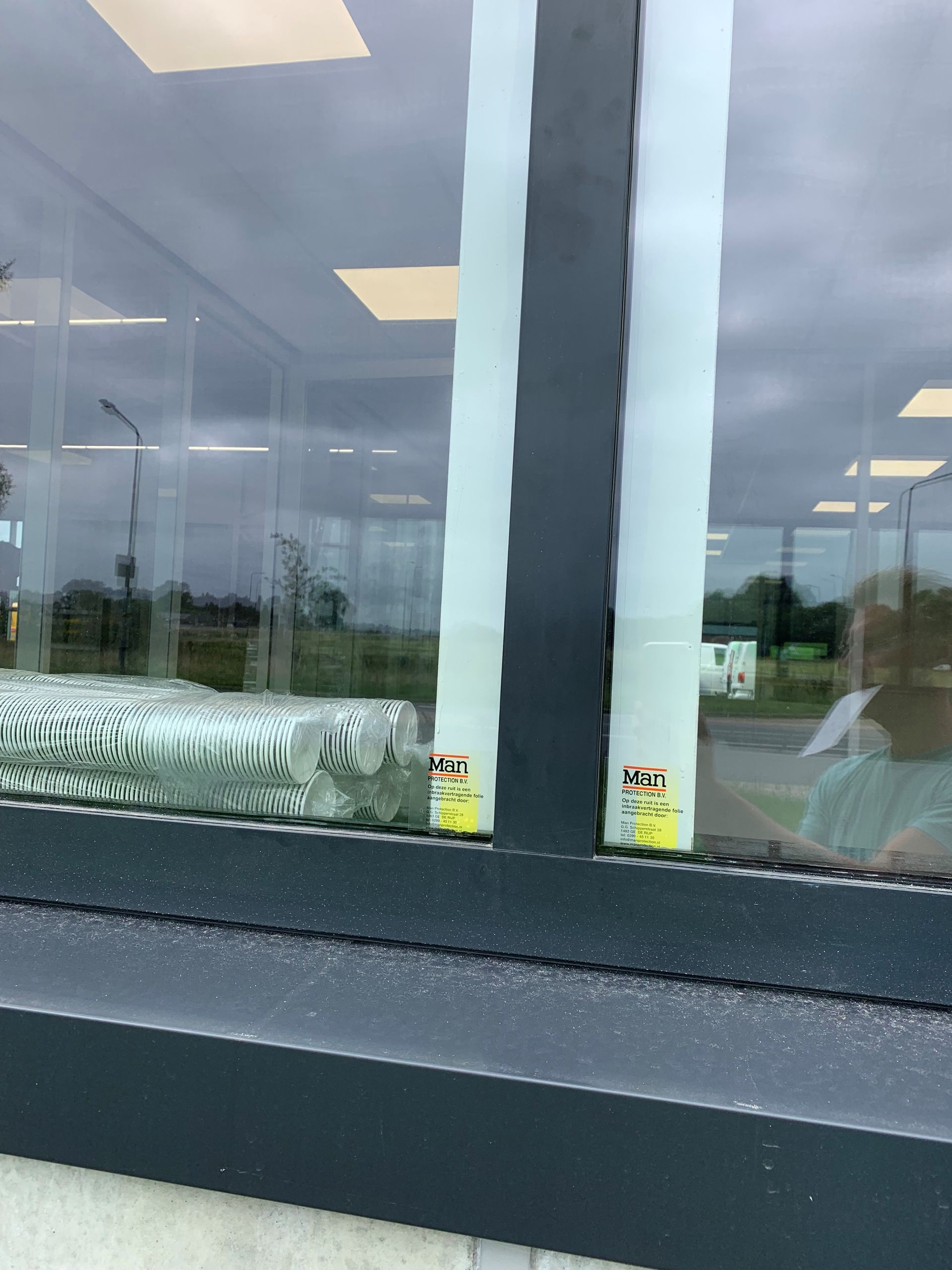 Tevens is door middel van stickers onderaan de ruiten zichtbaar gemaakt dat er een veiligheidsfolie is toegepast.