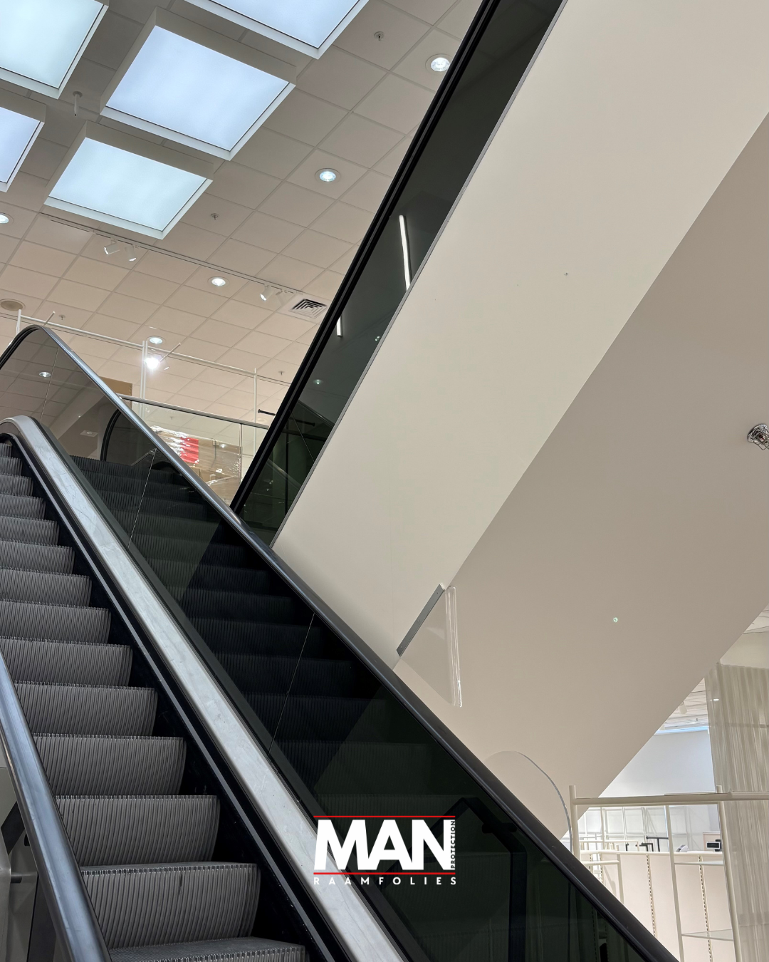 Bij de grote winkelketen Hennes & Mauritz hebben wij meerdere vestigingen de glazen zijden van de roltrap voorzien van een charcoal glasfolie.