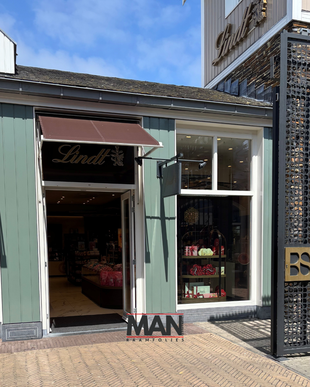 Bij het filiaal van Lindt te Bataviastad hebben we een warmtewerende raamfolie toegepast aan de buitenzijde van de ruiten. Op zonnige dagen smolt bij deze chocolaterie de chocolade achter het glas en wij hebben dit opgelost met een nagenoeg niet zichtbare warmtewerende glasfolie.