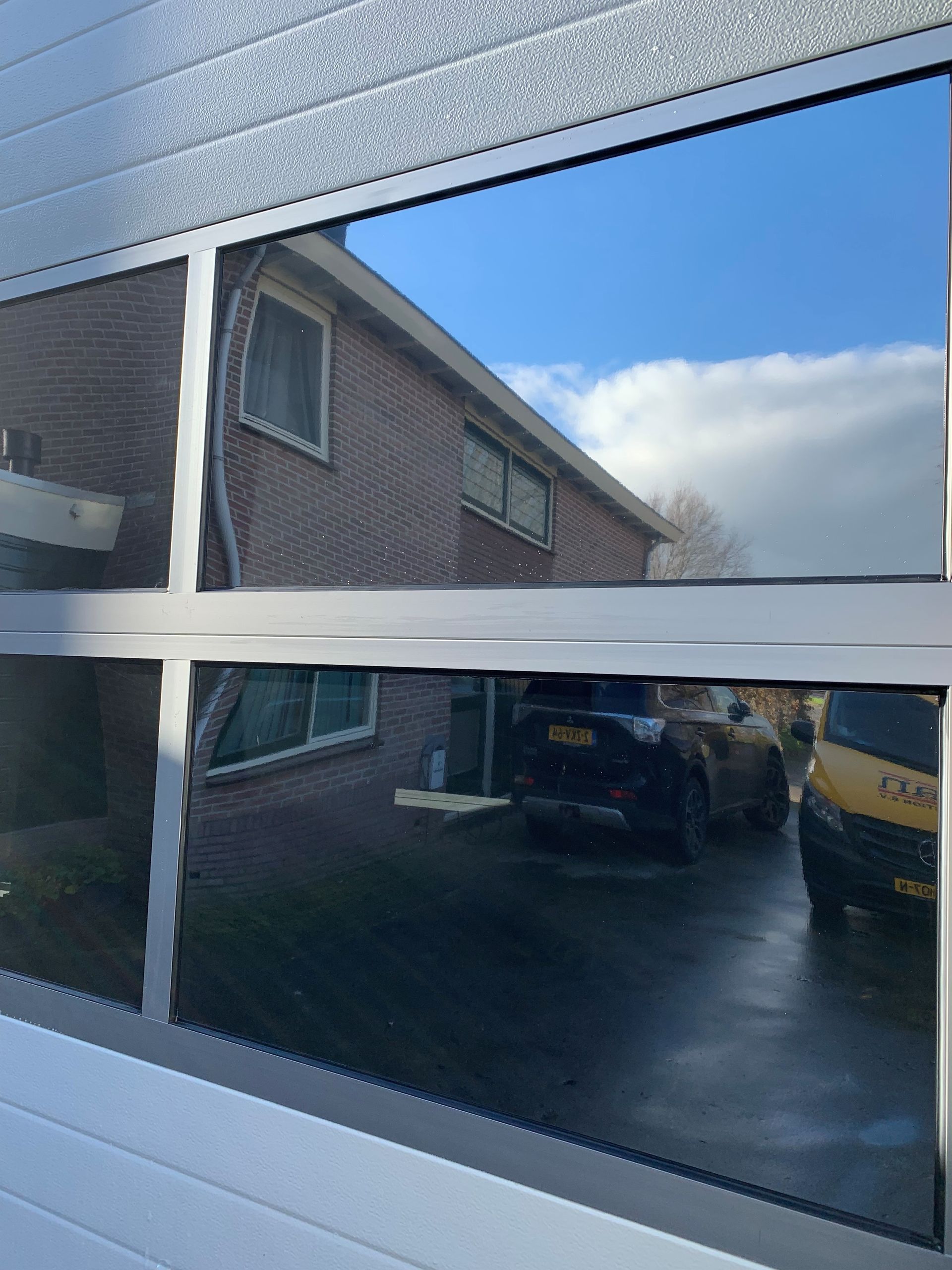 Bij de machinewerkplaats in Stompetoren hebben wij de kunststof ruiten van de roldeur voorzien van een warmtewerende folie.