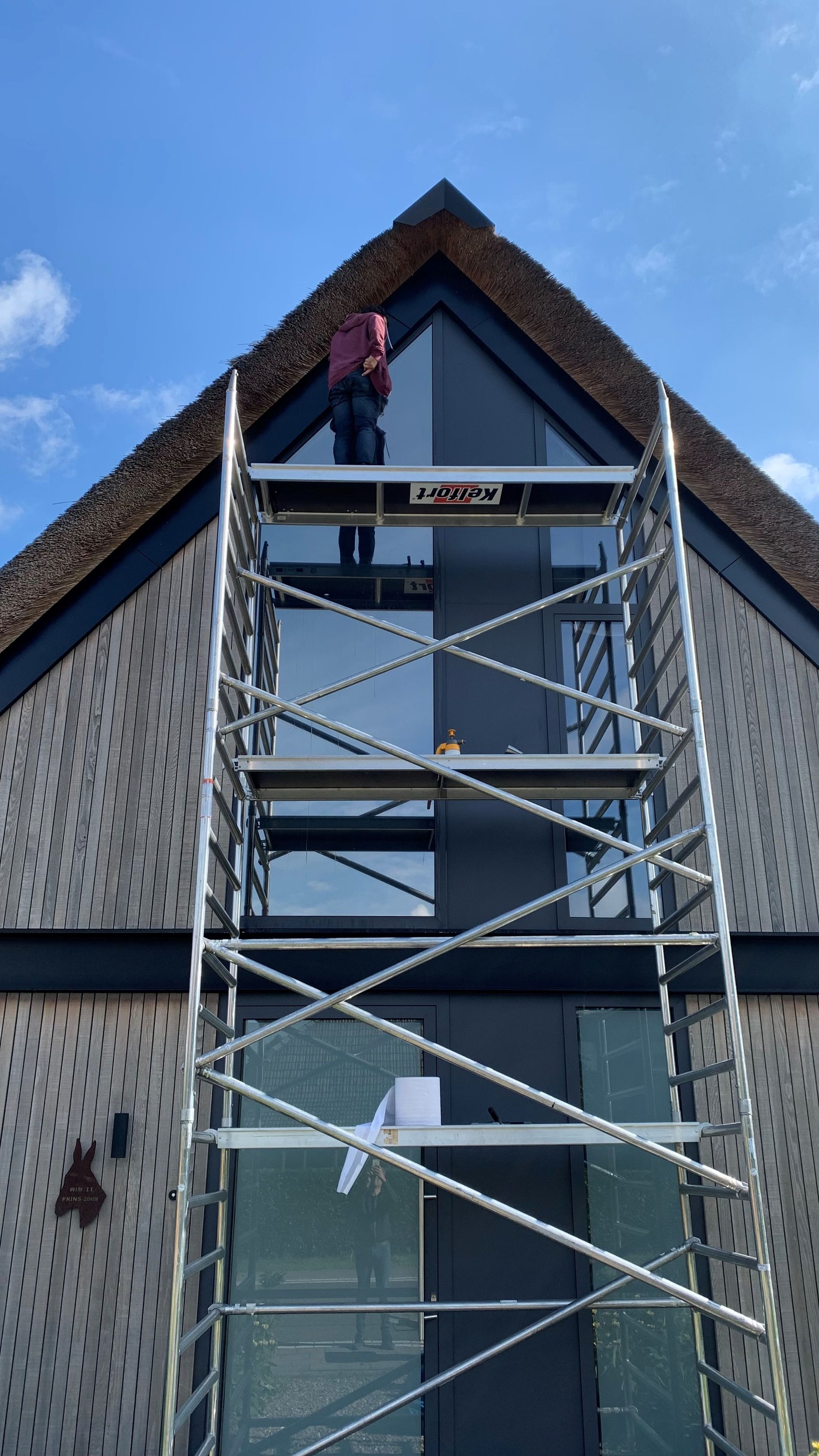 Bij een particuliere woning hebben wij de bovenruiten met behulp van een steiger voorzien van een warmtewerende glasfolie.