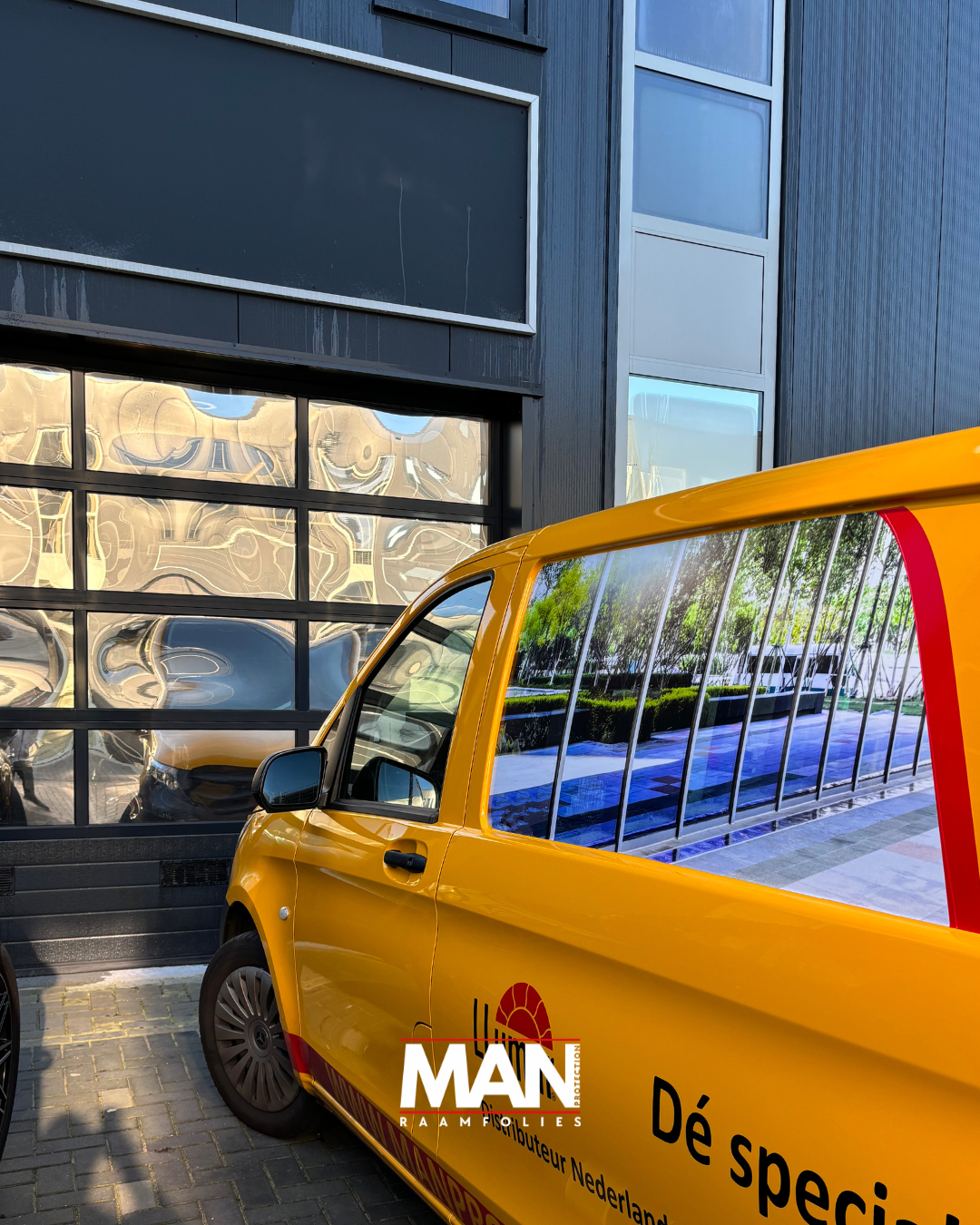 Bij Tyche M&B te Haarlem hebben wij de kunststof ruiten van de roldeur voorzien van een warmtewerende folie.